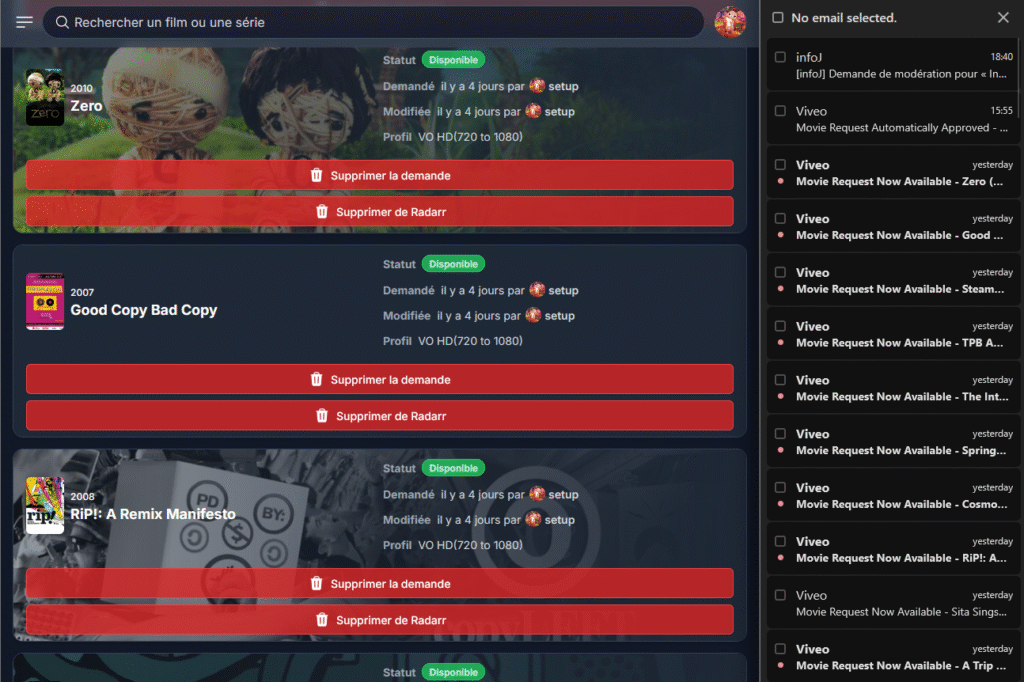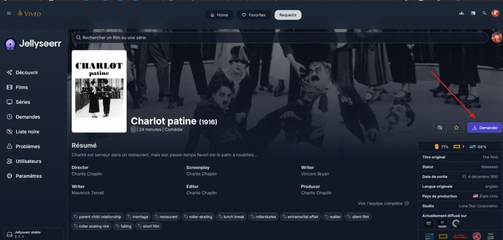 Vivéo propose un système de requêtes à ses utilisateurs pour leur permettre d’ajouter du contenu comme bon leur semble. Le système de requêtes est basé sur le moteur open source Jellyseerr.
